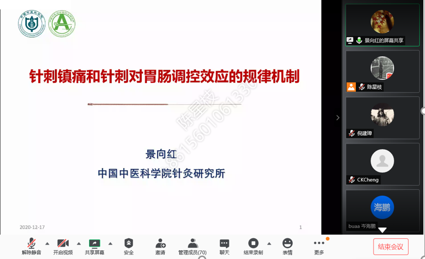 本次会议由北京航空航天大学生物与医学工程学院李儒雅副教授主持,来自中国中医科学院针灸研究所景所长,应邀作了题为“针刺镇痛和针刺对胃肠调控效应的规律机制”的精彩报告,约100名相关领域的专家学者参加了此次会议。