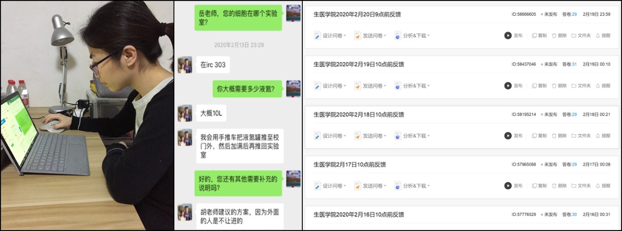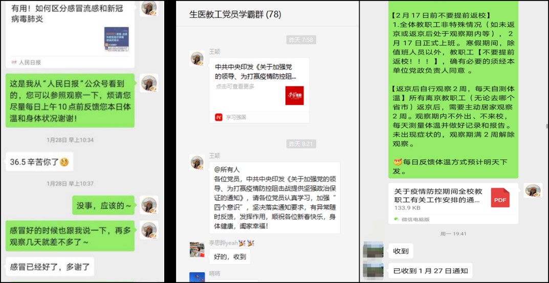 作为联络员的王颖快速协调身在外地的刘天亚、正在火车上的李思晔,4个小时内组建“小蜜蜂党员先锋队”,将全体教职工(含返聘、外籍、境外等)人员底数了解,明确分工,开展联系工作。腊月二十九晚到三十中午,仅用半天时间,三位小蜜蜂就完成了生医学院和生医高精尖中心教职工摸排工作,做到底数清、情况明、沟通畅。