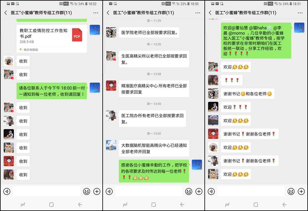 医工学院党政办主任林欧雅也是第一时间加入医工联动“小蜜蜂”专组的,无论是生医学院、医工学院还是医工交叉创新研究院,大家接到任务都会在群里实时分享,研讨方案,迅速响应。随着工作的深入和默契,医工交叉创新研究院办王津墨、大数据脑机智能高精尖中心联系人董仙慧、大数据精准医疗高精尖中心石磊晶等几位老师也从独立作战到加入“小蜜蜂”战队,通过网络平台逐一对全体105名教职员工身体状开展排查,建立台账、实时更新、每日报备、后续追踪 “全过程防控”。她们针对疫情严重地区行政人员“一对一”联系对接,努力协调解决其实际困难,为急需口罩教师寄送口罩,切实解决教职工存在的困难,传递温暖;快速梳理核实全院教职员工信息,重点梳理教职工返京时间等动态信息,每日开展全员排查。