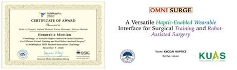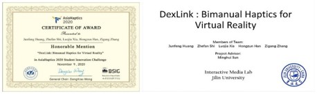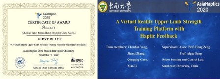 亚洲触觉会议学生创新挑战赛通过项目提案,开发报告及演示视频提交,最后由组委会评选得出1个最嘉奖和2个荣誉奖。经过6个多月的准备,三个团队脱颖而出,其中东南大学学生团队作品“A Virtual Reality Upper-Limb Strength Training Platform with Haptic Feedback”获得第一名、日本京都大学学生团队作品“OmniSurge: A Versatile Haptic-enabled Wearable Interface For Efficient Virtual Training and Real Robot-Assisted Surgery”获得荣誉奖、吉林大学学生团队作品“DexLink :Bimanual Haptics for Virtual Reality”获得荣誉奖。