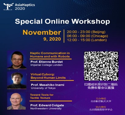 第四届亚洲触觉会议(AsiaHaptics2020)线上研讨会由北京航空航天大学主办,由北京图象图形学学会、生物医学工程高精尖创新中心虚拟现实技术与系统国家重点实验室协办,于2020年11月9日晚上8:00-11:00在线上成功召开。会议全程面向观众免费开放,突破了地域限制,扩大了传播力和影响力,得到了触觉领域专家学者和行业同仁的高度关注,会议在直播平台同时在线观看人次超7000人。