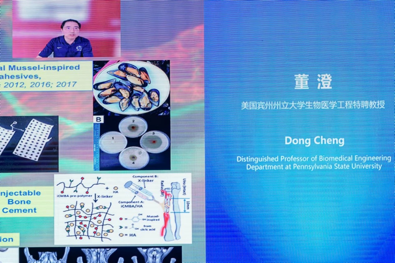 董澄教授就“国际生物医学工程进展及对医学和工业技术创新产生变革性影响”做了视频演讲,着重介绍了组织工程领域研究热点,结合靶向肿瘤药物研究进展,对未来如何开展医工交叉进行探讨和展望。