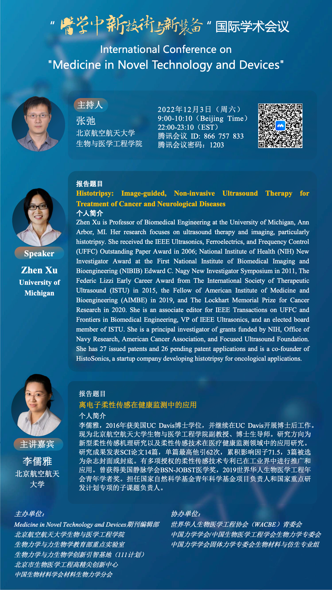 本次会议由Medicine in Novel Technology and Devices期刊编辑部、北京航空航天大学生物与医学工程学院、生物力学与力生物学教育部重点实验室、生物力学与力生物学创新引智基地(111计划)、北京市生物医学工程高精尖创新中心、中国生物材料学会材料生物力学分会主办,由世界华人生物医学工程协会(WACBE)青委会、中国力学学会/中国生物医学工程学会生物力学专委会、中国力学学会固体力学专委会生物材料与仿生专业组协办,医学中新技术与新装备国际学术会议将于2022年11月-12月以线上方式举办。