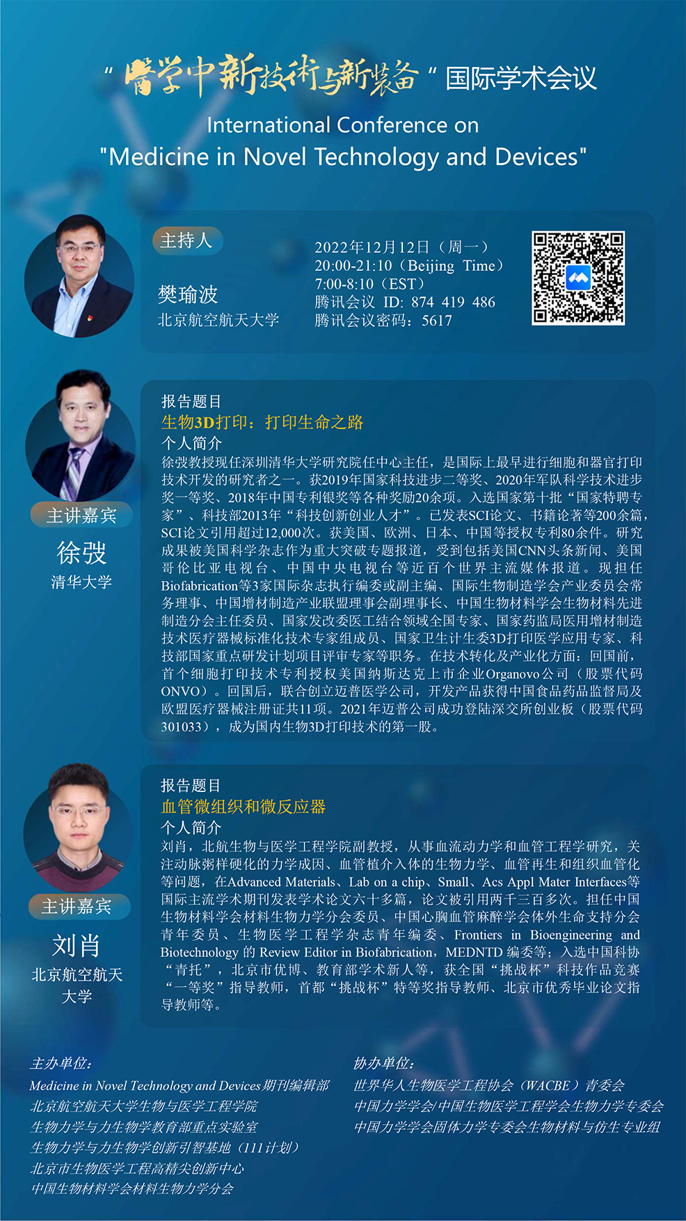 本次会议由Medicine in Novel Technology and Devices期刊编辑部、北京航空航天大学生物与医学工程学院、生物力学与力生物学教育部重点实验室、生物力学与力生物学创新引智基地(111计划)、北京市生物医学工程高精尖创新中心、中国生物材料学会材料生物力学分会主办,由世界华人生物医学工程协会(WACBE)青委会、中国力学学会/中国生物医学工程学会生物力学专委会、中国力学学会固体力学专委会生物材料与仿生专业组协办,医学中新技术与新装备国际学术会议将于2022年11月-12月以线上方式举办。