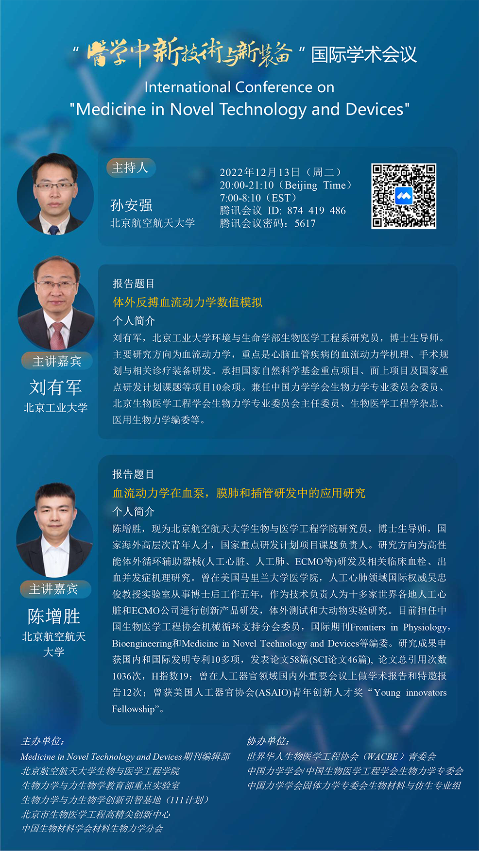 本次会议由Medicine in Novel Technology and Devices期刊编辑部、北京航空航天大学生物与医学工程学院、生物力学与力生物学教育部重点实验室、生物力学与力生物学创新引智基地(111计划)、北京市生物医学工程高精尖创新中心、中国生物材料学会材料生物力学分会主办,由世界华人生物医学工程协会(WACBE)青委会、中国力学学会/中国生物医学工程学会生物力学专委会、中国力学学会固体力学专委会生物材料与仿生专业组协办,医学中新技术与新装备国际学术会议将于2022年11月-12月以线上方式举办。