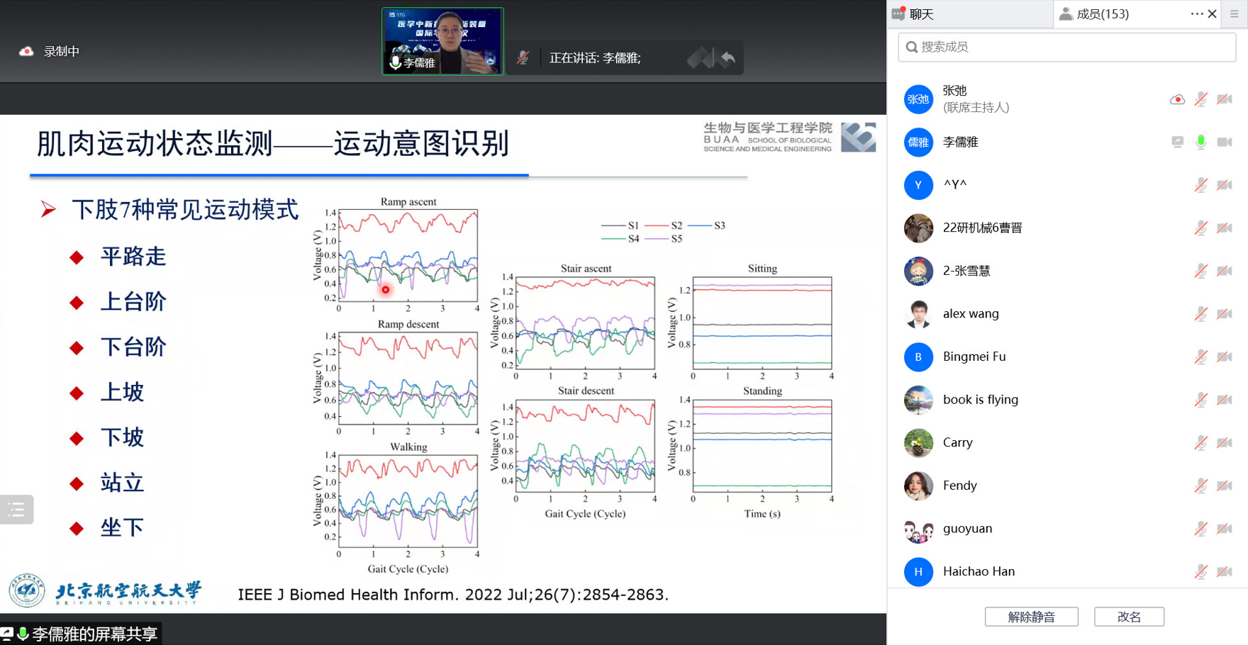 本场会议邀请到密歇根大学徐蓁教授和北京航空航天大学李儒雅教授,分别作了《lmage-guided, Non-invasive Ultrasound Therapy for Treatment of Cancer and Neurological Diseases》和《离电子柔性传感在健康监测中的应用》的精彩报告。会议由北京航空航天大学张弛教授主持。参会的专家、学者和学生达153人。