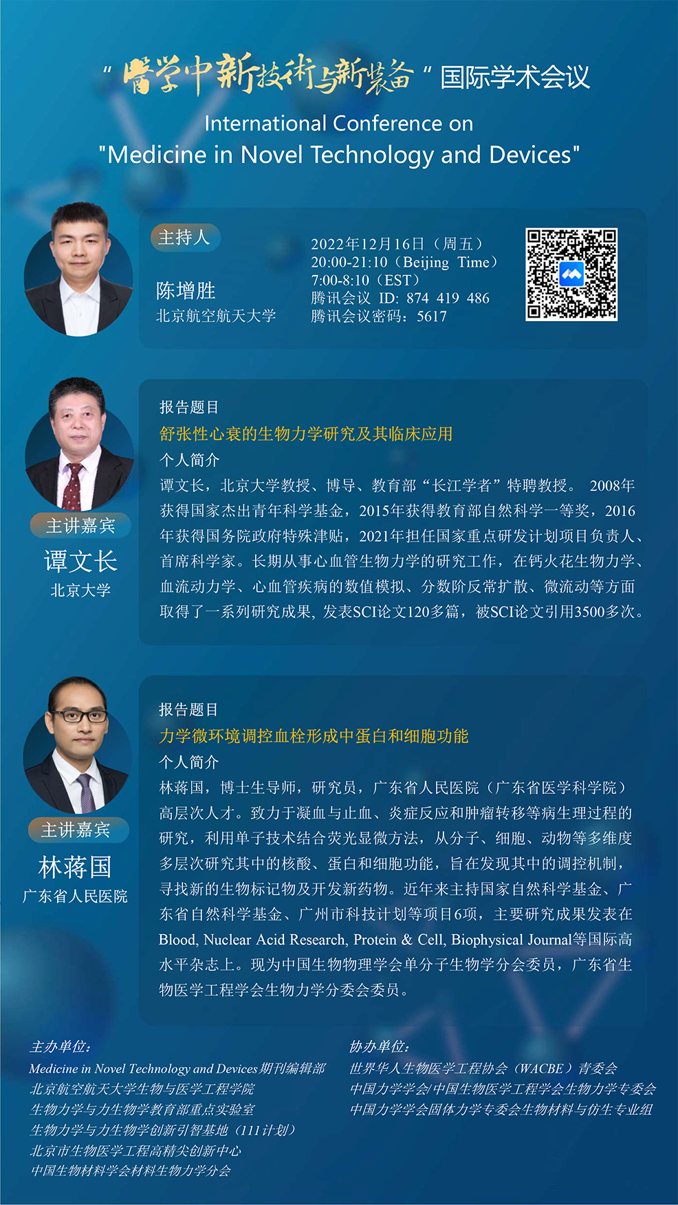 本次会议由Medicine in Novel Technology and Devices期刊编辑部、北京航空航天大学生物与医学工程学院、生物力学与力生物学教育部重点实验室、生物力学与力生物学创新引智基地(111计划)、北京市生物医学工程高精尖创新中心、中国生物材料学会材料生物力学分会主办,由世界华人生物医学工程协会(WACBE)青委会、中国力学学会/中国生物医学工程学会生物力学专委会、中国力学学会固体力学专委会生物材料与仿生专业组协办,医学中新技术与新装备国际学术会议将于2022年11月-12月以线上方式举办。