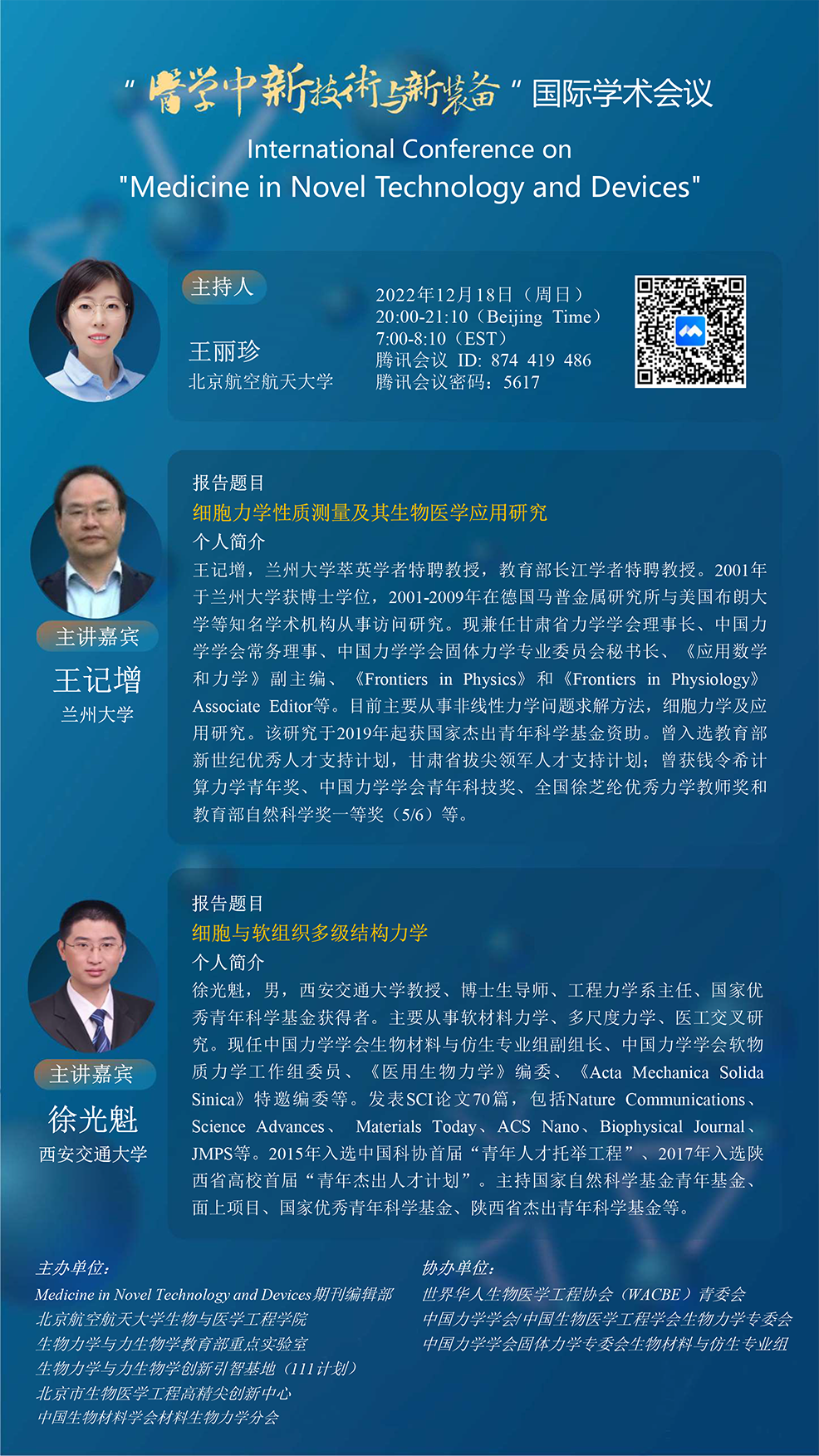 本次会议由Medicine in Novel Technology and Devices期刊编辑部、北京航空航天大学生物与医学工程学院、生物力学与力生物学教育部重点实验室、生物力学与力生物学创新引智基地(111计划)、北京市生物医学工程高精尖创新中心、中国生物材料学会材料生物力学分会主办,由世界华人生物医学工程协会(WACBE)青委会、中国力学学会/中国生物医学工程学会生物力学专委会、中国力学学会固体力学专委会生物材料与仿生专业组协办,医学中新技术与新装备国际学术会议将于2022年11月-12月以线上方式举办。