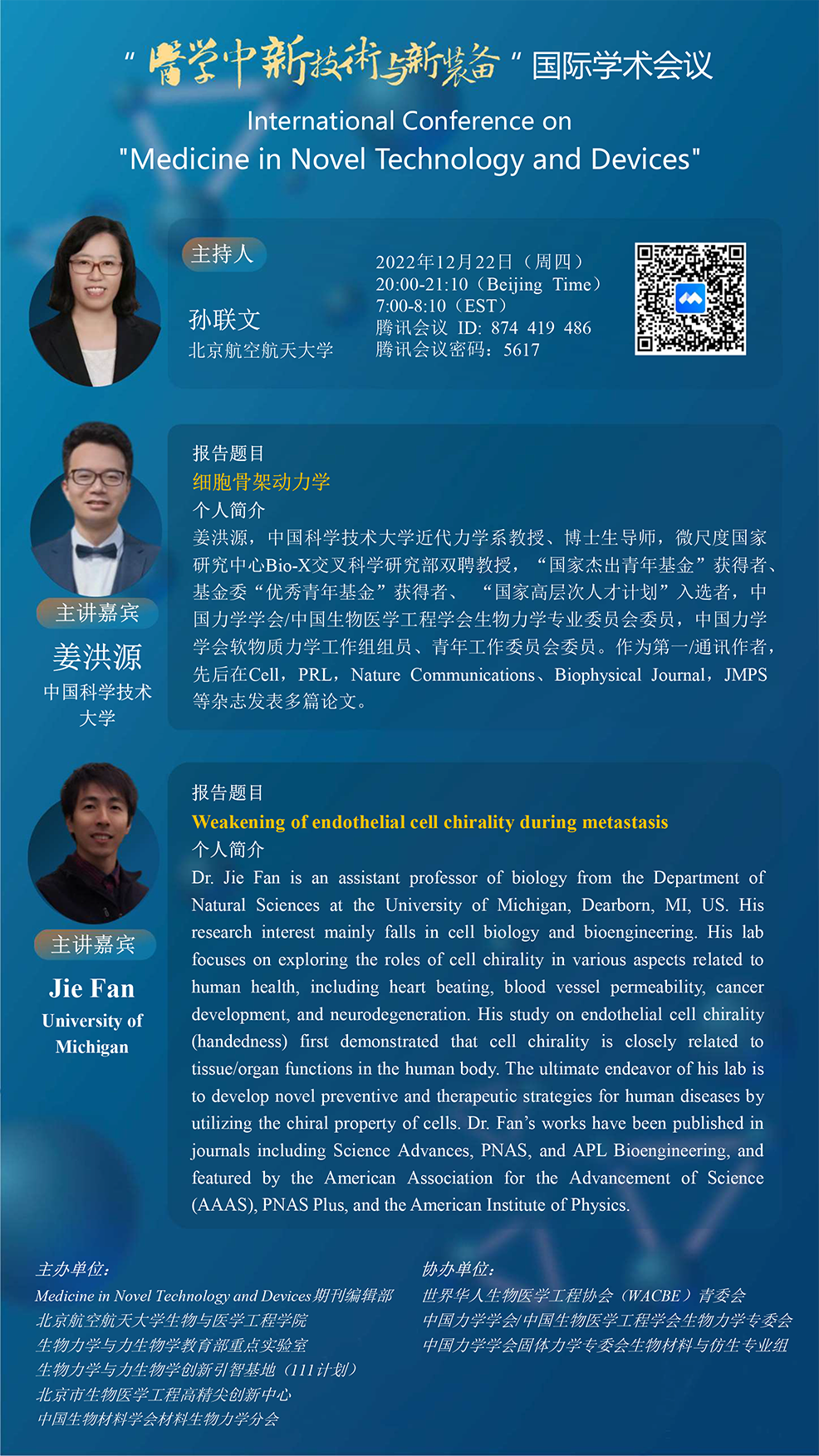 本次会议由Medicine in Novel Technology and Devices期刊编辑部、北京航空航天大学生物与医学工程学院、生物力学与力生物学教育部重点实验室、生物力学与力生物学创新引智基地(111计划)、北京市生物医学工程高精尖创新中心、中国生物材料学会材料生物力学分会主办,由世界华人生物医学工程协会(WACBE)青委会、中国力学学会/中国生物医学工程学会生物力学专委会、中国力学学会固体力学专委会生物材料与仿生专业组协办,医学中新技术与新装备国际学术会议将于2022年11月-12月以线上方式举办。
