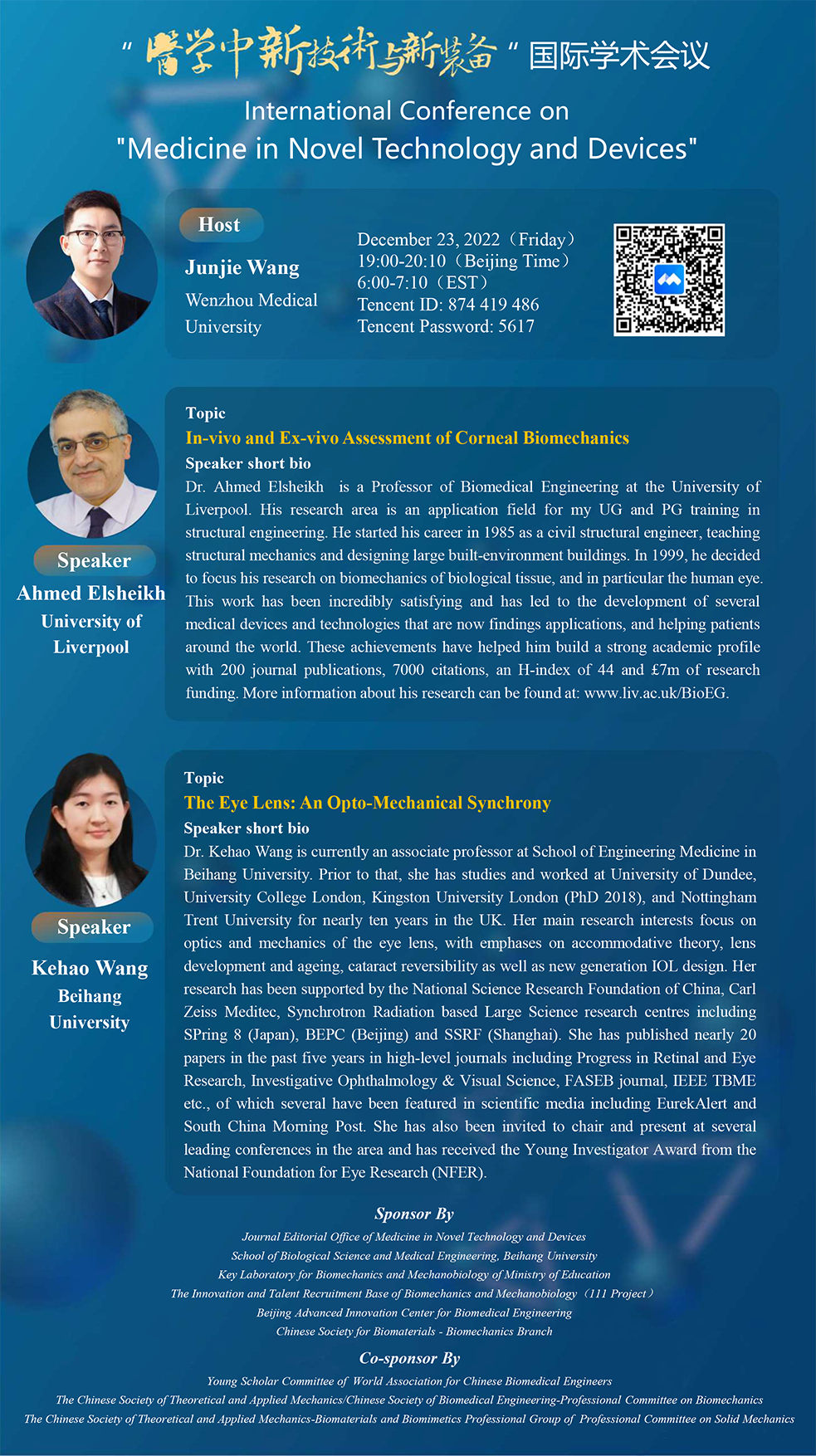 本次会议由Medicine in Novel Technology and Devices期刊编辑部、北京航空航天大学生物与医学工程学院、生物力学与力生物学教育部重点实验室、生物力学与力生物学创新引智基地(111计划)、北京市生物医学工程高精尖创新中心、中国生物材料学会材料生物力学分会主办,由世界华人生物医学工程协会(WACBE)青委会、中国力学学会/中国生物医学工程学会生物力学专委会、中国力学学会固体力学专委会生物材料与仿生专业组协办,医学中新技术与新装备国际学术会议将于2022年11月-12月以线上方式举办。