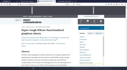 Communications杂志以在线全文Article的形式发表了我校化学学院程群峰教授课题组在超韧材料的最新研究成果“Super-tough MXene-functionalized graphene sheets”。周天柱博士、吴超教授、王艳磊副研究员为第一作者,程群峰教授为通讯作者,北京航空航天大学为第一完成单位。