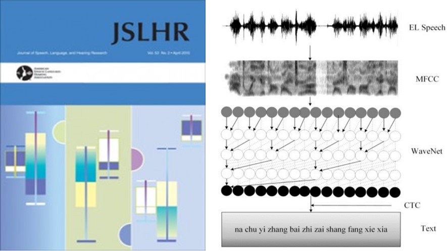 在上述研究基础上,近来课题组又提出了应用深度学习技术改善汉语普通话电子喉语音质量的研究思路,尝试把WaveNet技术引入补偿后语音的识别与转换研究中,但是由于电子喉语音基频平坦,识别率明显偏低。课题组通过语音语料的采集、汇总与训练,深入研究了电子喉语音识别与转换系统,结合CTC技术的组合应用取得了很好的增强效果。该研究成果已被接受并于近期发表于语音与听觉康复研究领域的著名期刊《Journal of Speech, Language, and Hearing Research》,该成果由北航生物与医学工程学院、北京市生物医学工程高精尖创新中心共同完成,北航生物与医学工程学院博士研究生钱兆鹏为论文第一作者,牛海军教授为通讯作者。该研究充分应用了深度学习技术的优势,首次运用此方法解决电子喉的汉语发声问题,为电子喉语音质量的改善和可懂度的提升提供了一种新的研究路径,有助于进一步帮助喉切除患者补偿言语发声功能并提高患者的生活质量。