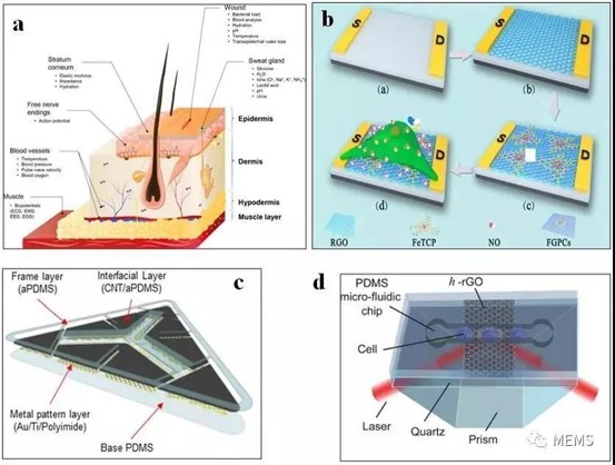 图2 有望具备单细胞精度的可穿戴传感器。(a)可从皮肤细胞检测到的代表性信号。(b)rGO/FeTCPs FET传感器用于单细胞精度NO检测;(c)基于CNT/PDMS的ECG电极;(d)基于微流控的单细胞检测芯片。