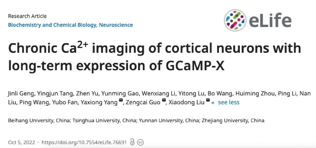 近日,国际学术期刊《eLife》在线发表题为“Chronic Ca2+ imaging of cortical neurons with long-term expression of GCaMP-X”的研究论文。该工作由北京航空航天大学生物医学工程高精尖创新中心刘晓冬教授课题组联合樊瑜波教授团队与合作者共同完成。钙动态的长期监测对于神经科学等领域意义重大,但在实际应用中,由于常用基因编码钙离子荧光探针GCaMP具有细胞毒性而受到多方面的限制。基于刘晓冬课题组此前自主设计开发的改进版钙探针GCaMP-X(Nature Communications 2018, DOI: 10.1038/s41467-018-03719-6),此项工作进一步展示了GCaMP-X优于GCaMP的神经元相容性,实现了离体培养神经元(共聚焦)和活体小鼠大脑皮层(双光子)的长时程GCaMP-X成像,定量揭示了自发钙振荡与神经元形态发育的紧密关联,为神经科学及相关领域的长期钙成像提供了简便而有效的新方案。