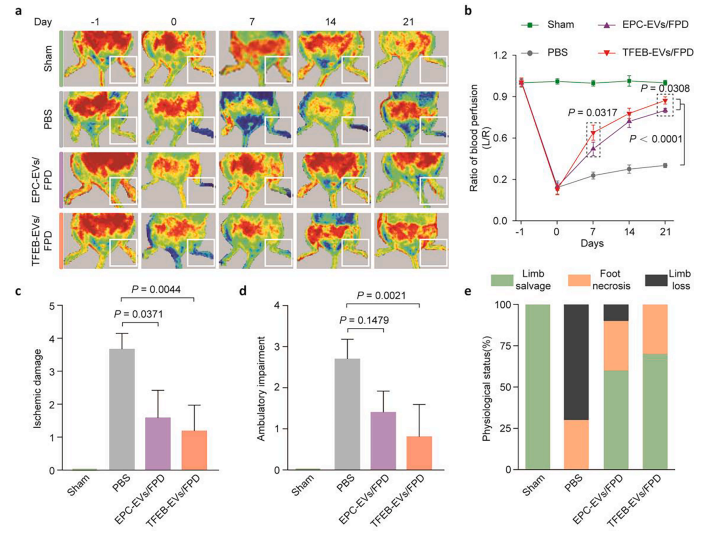 外周动脉疾病(Peripheral artery disease, PAD)是一种由外周动脉狭窄或闭塞引起的疾病。在PAD发病的早期,患者往往没有明显的临床症状,随着PAD进展至末期,患者将表现为严重下肢缺血(Critical limb ischemia, CLI),此时患者会产生严重的静息痛、下肢坏疽,截肢和死亡风险也显著增加。临床上CLI的常规治疗策略主要包括药物治疗、血管外科手术以及截肢。但药物副作用、术后再狭窄以及严重的生理和心理创伤限制了这些治疗策略的应用。因此,开发治疗CLI的新策略以克服常规疗法的诸多局限性具有重要的临床意义和应用价值。
