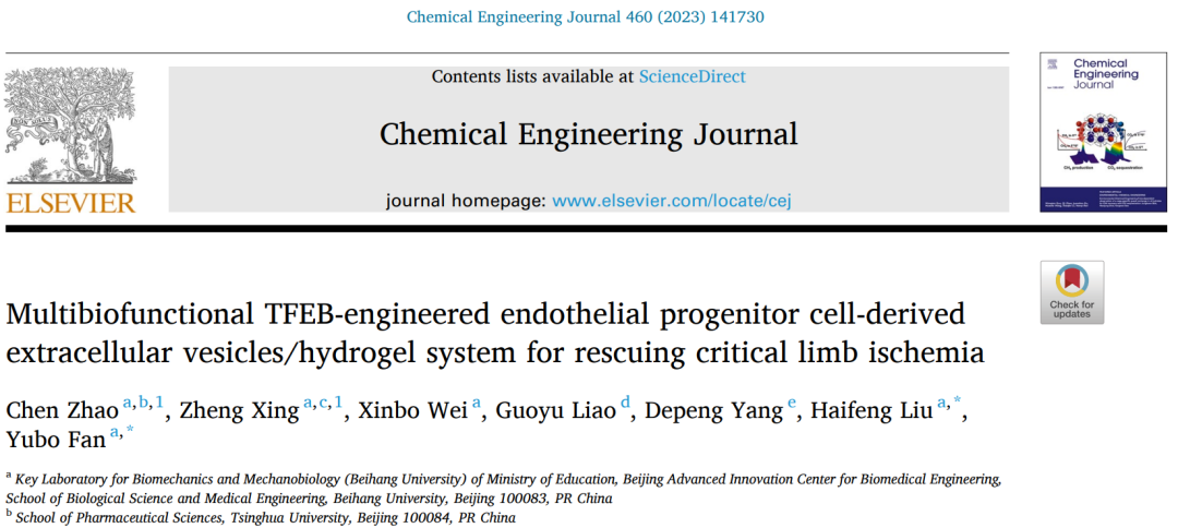近日,国际著名学术期刊《Chemical Engineering Journal》(影响因子16.744, Engineering/Chemical, Q1, 4/143)在线发表题为“Multibiofunctional TFEB-engineered endothelial progenitor cell-derived extracellular vesicles/hydrogel system for rescuing critical limb ischemia”的研究论文,针对严重下肢缺血提出了一种基于治疗性血管新生和细胞外囊泡的新型治疗策略。该工作由北航生物与医学工程学院、北京生物医学工程高精尖创新中心、生物力学与力学生物学教育部重点实验室樊瑜波教授课题组完成。