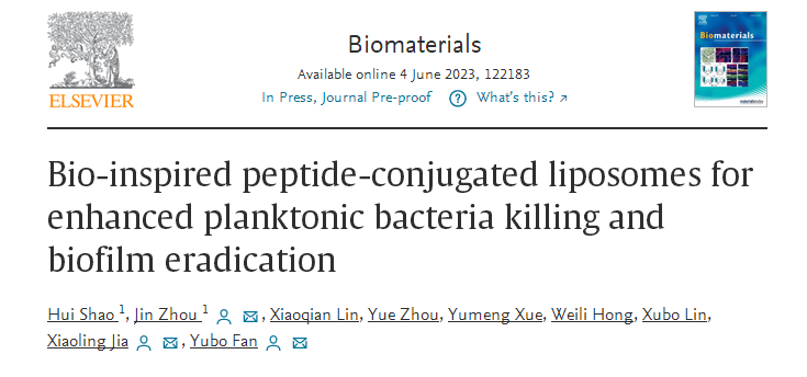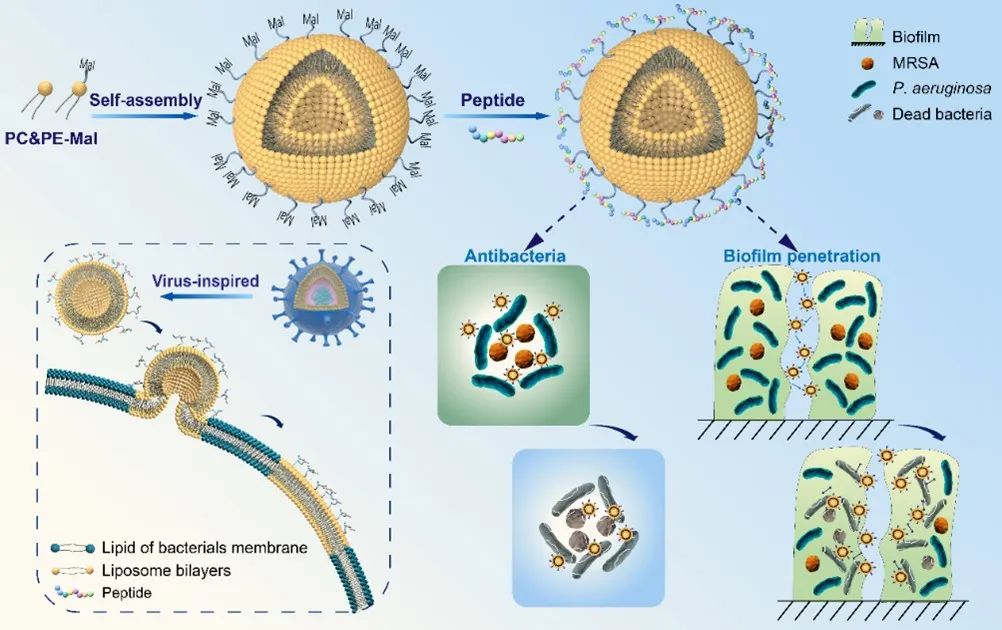 近日,北京航空航天大学生物与医学工程学院/医学科学与工程学院、北京生物医学工程高精尖中心、生物力学与力学生物学教育部重点实验室樊瑜波教授(通讯作者)研究团队,受病毒侵染细胞膜启发,设计和开发了一种用于治疗耐药菌和生物被膜感染的仿生脂质体材料。相关成果“Bio-inspired Peptide-conjugated Liposomes for Enhanced Planktonic Bacteria Killing and Biofilm Eradication”发表于生物材料著名期刊《Biomaterials》(IF 15.304,Q1区)。